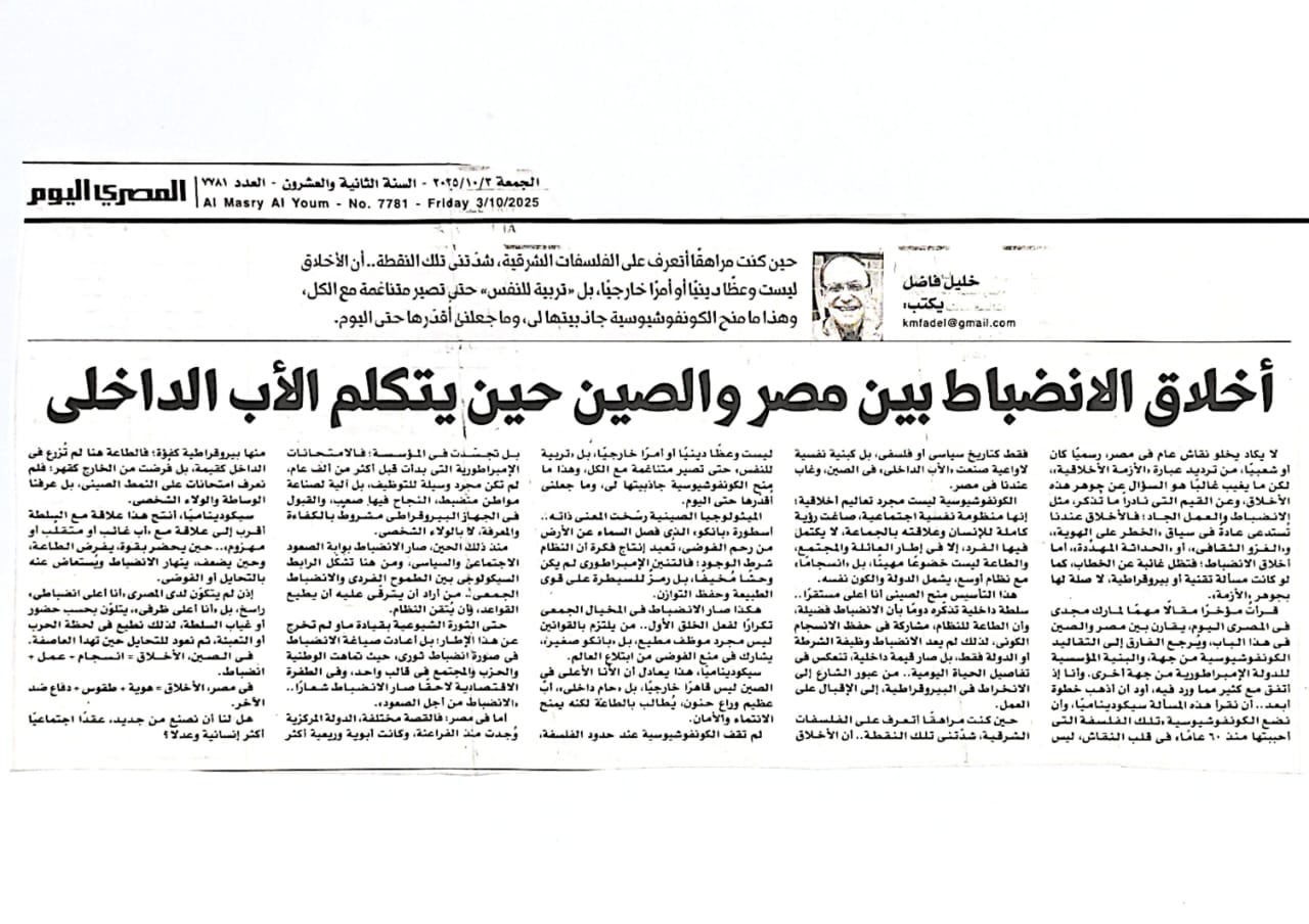 قرأتُ مؤخرًا مقالًا مهمًا لمارك مجدى فى المصرى اليوم، يقارن بين مصر والصين فى هذا الباب، ويُرجع الفارق إلى التقاليد الكونفوشيوسية من جهة، والبنية المؤسسية للدولة الإمبراطورية من جهة أخرى. وأنا إذ أتفق مع كثير مما ورد فيه، أود أن أذهب خطوة أبعد.. أن نقرأ هذه المسألة سيكوديناميًا، وأن نضع الكونفوشيوسية «تلك الفلسفة التى أحببتها منذ ٦٠ عامًا» فى قلب النقاش، ليس فقط كتاريخ سياسى أو فلسفى، بل كبنية نفسية لاواعية صنعت «الأب الداخلى» فى الصين، وغاب عندنا فى مصر.