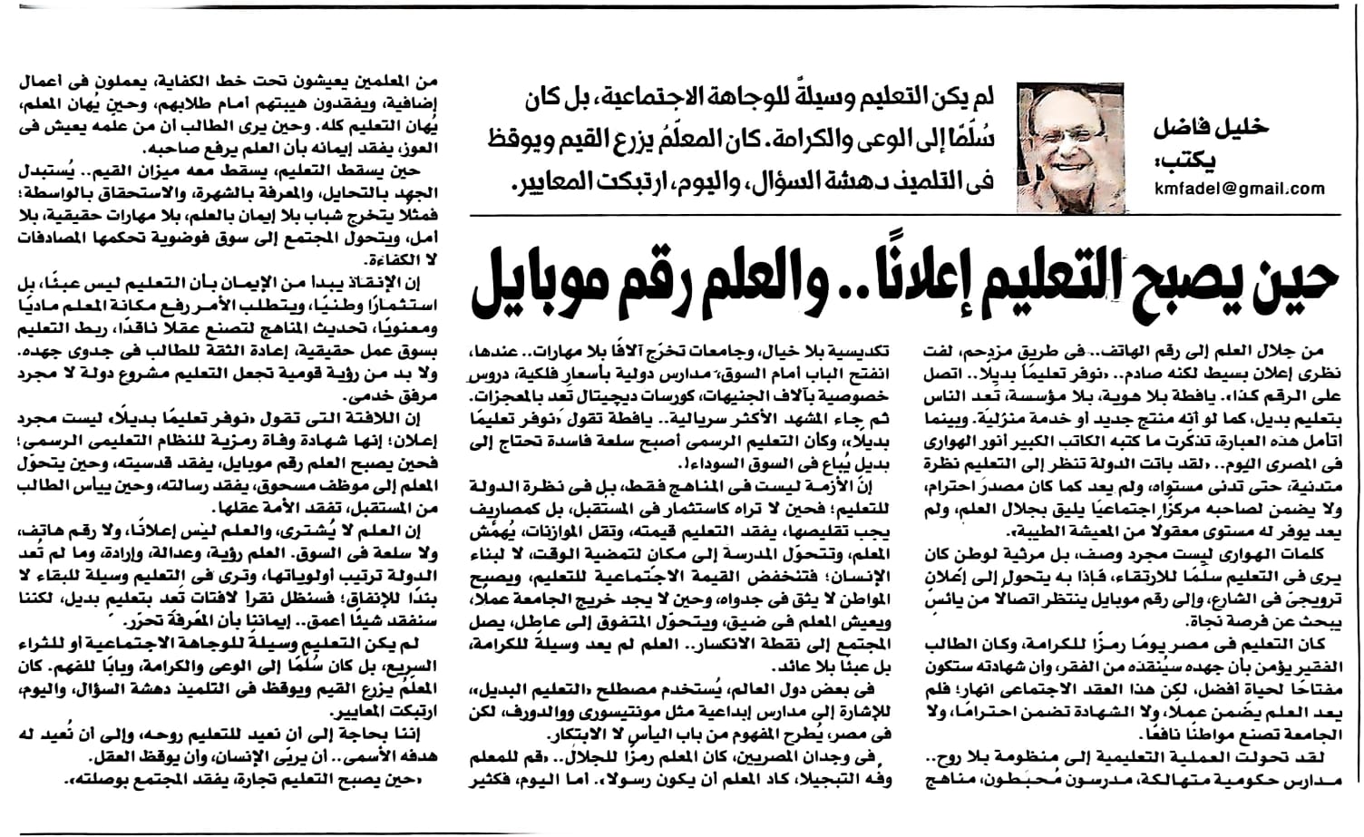 من جلال العلم إلى رقم الهاتف.. فى طريقٍ مزدحم، لفت نظرى إعلان بسيط لكنه صادم.. «نوفر تعليمًا بديلًا.. اتصل على الرقم كذا». يافطة بلا هوية، بلا مؤسسة، تَعِد الناس بتعليم بديل، كما لو أنه منتج جديد أو خدمة منزلية. وبينما أتأمل هذه العبارة، تذكّرت ما كتبه الكاتب الكبير أنور الهوارى فى المصرى اليوم.. «لقد باتت الدولة تنظر إلى التعليم نظرة متدنية، حتى تدنى مستواه، ولم يعد كما كان مصدرَ احترام، ولا يضمن لصاحبه مركزًا اجتماعيًا يليق بجلال العلم، ولم يعد يوفر له مستوى معقولًا من المعيشة الطيبة».