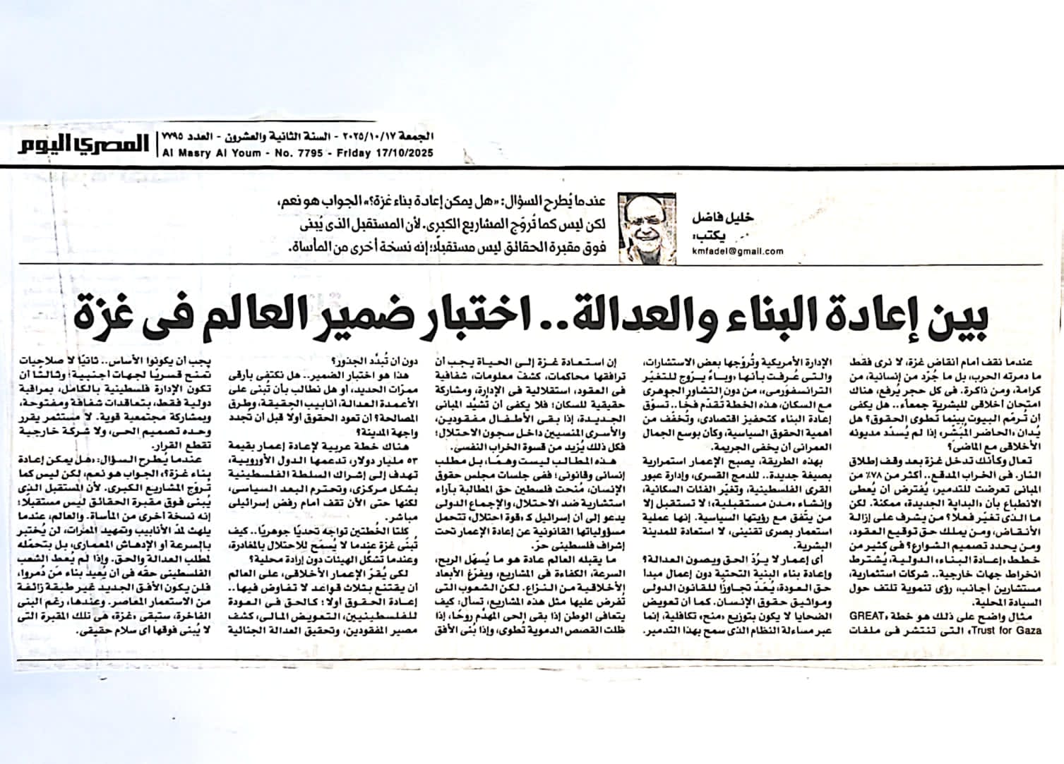 إن استعادة غزة إلى الحياة يجب أن ترافقها محاكمات، كشف معلومات، شفافية فى العقود، استقلالية فى الإدارة، ومشاركة حقيقية للسكان؛ فلا يكفى أن تُشيَّد المبانى الجديدة، إذا بقى الأطفال مفقودين، والأسرى المنسيين داخل سجون الاحتلال؛ فكل ذلك يُزيد من قسوة الخراب النفسى.
