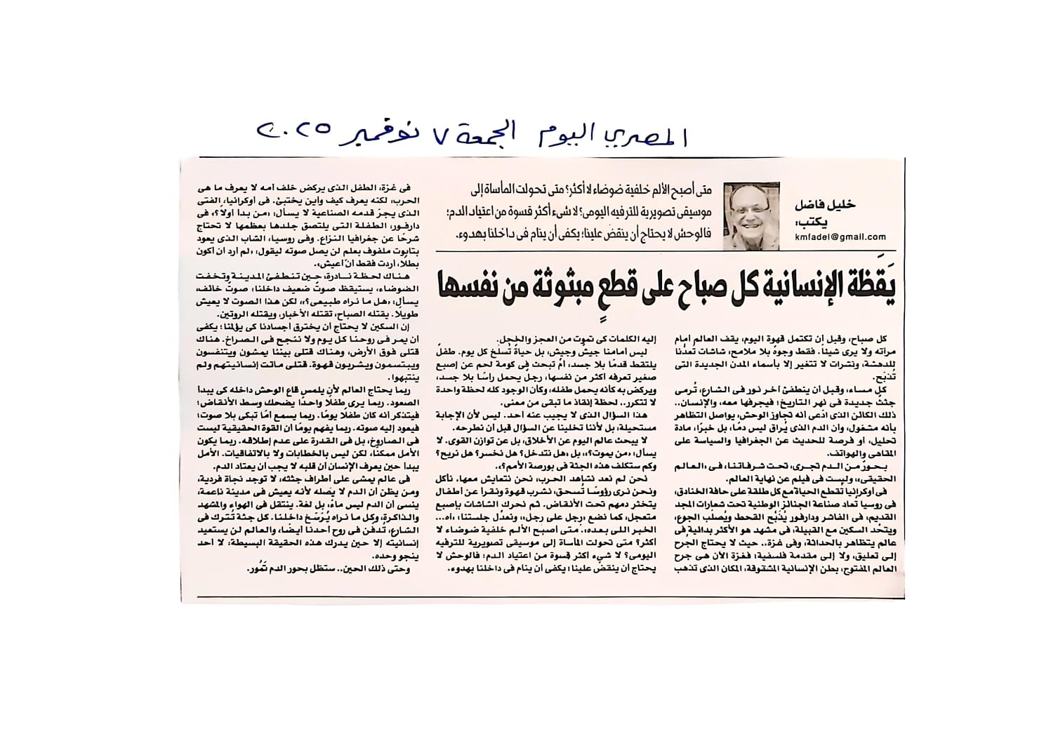فى أوكرانيا تُقطع الحياة مع كل طلقة على حافة الخنادق، فى روسيا تُعاد صناعة الجنائز الوطنية تحت شعارات المجد القديم، فى الفاشر ودارفور يُذَبَّح القحط ويُصلَب الجوع، ويتحِّد السكين مع القبيلة، فى مشهد هو الأكثر بدائية فى عالم يتظاهر بالحداثة، وفى غزة.. حيث لا يحتاج الجُرح إلى تعليق، ولا إلى مقدمة فلسفية؛ فغزة الآن هى جرح العالم المفتوح، بطن الإنسانية المشقوقة، المكان الذى تذهب إليه الكلمات كى تموت من العجز والخجل.