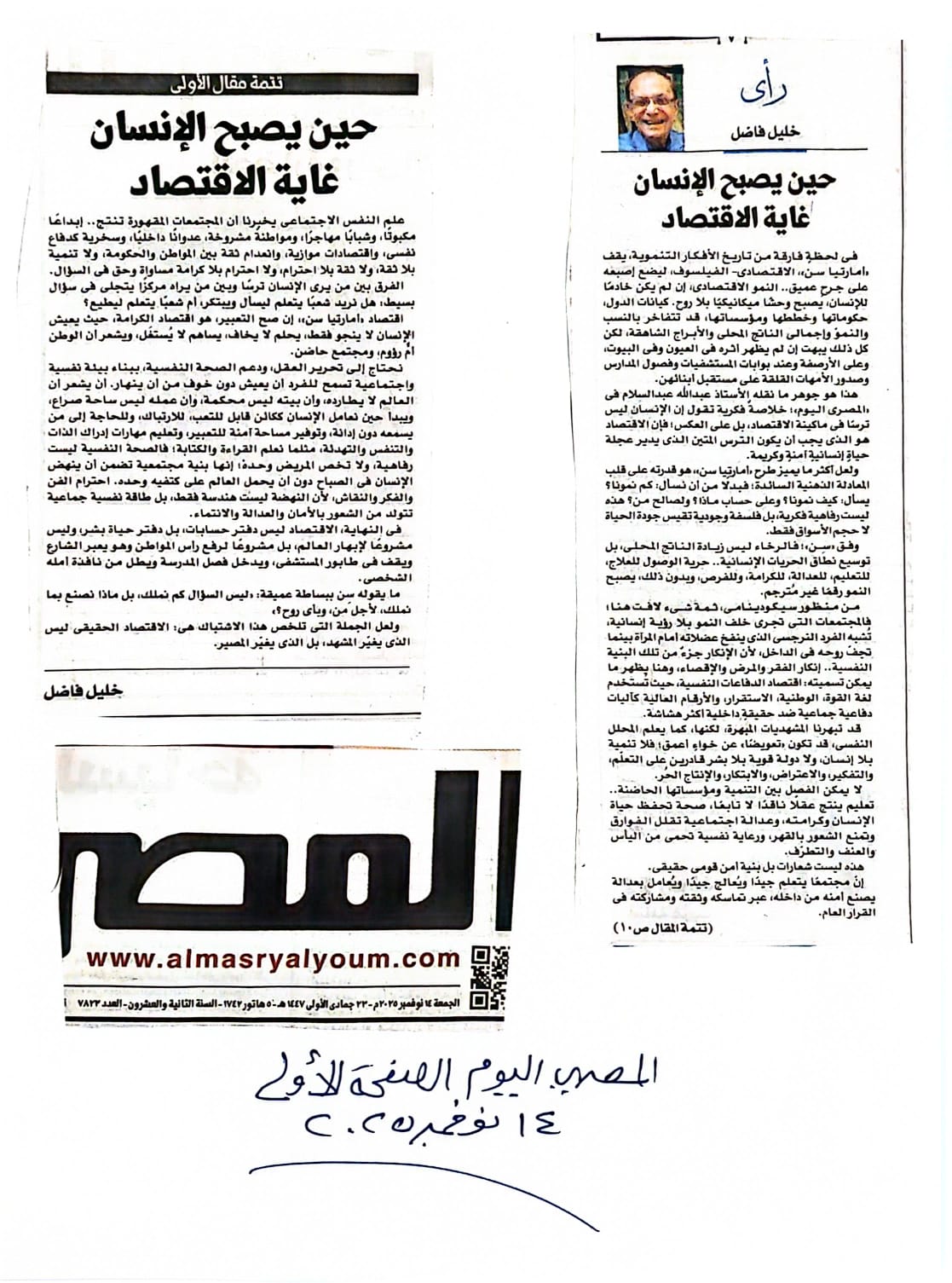 هذا هو جوهر ما نقله الأستاذ عبدالله عبدالسلام فى «المصرى اليوم»؛ خلاصةٌ فكرية تقول إن الإنسان ليس ترسًا فى ماكينة الاقتصاد، بل على العكس؛ فإن الاقتصاد هو الذى يجب أن يكون الترس المتين الذى يدير عجلة حياةٍ إنسانيةٍ آمنةٍ وكريمة.