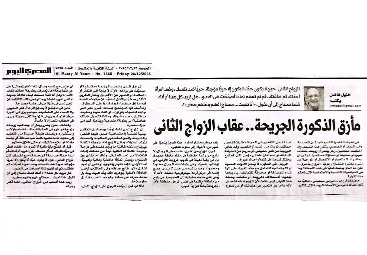 ولذلك، حين يقرر رجل أن «يعاقب» زوجته بزواجٍ آخر، فهو فى الحقيقة يُعاقب نفسه، وأولاده، واستقراره. ويضيف طبقةً جديدة من التعقيد إلى مشهد كانت تكفيه كلمة حب صادقة، أو جلسة هادئة، أو علاج مشترك، أو حتى طلاق محترم.