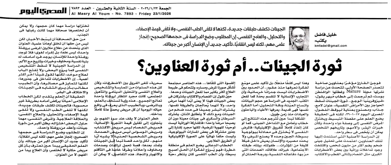 فوجئ القارئ مؤخرًا بعناوين صاخبة تتصدّر الصفحة الأولى، تتحدث عن دراسة نشرتها مجلة Nature وغطتها الواشنطن بوست، ثم تُرجمت إلى خطاب مُبهر يقول: «شيزوفرينيا الوجع.. ثورة الجينات تسقط الحواجز بين الأمراض النفسية»، عنوان لامع، جذاب، ومصنوع بعناية ليوقظ الفضول، المصرى اليوم ١٧-١-٢٦، لكنه فى الحقيقة يضع العلم على مقصلة التبسيط ويختزل المرض النفسى إلى وصفة دواء واحدة، وكأن خبرات البشر، وآلامهم، وتاريخهم الشخصى يمكن أن يُلَخّص فى سطر واحد.