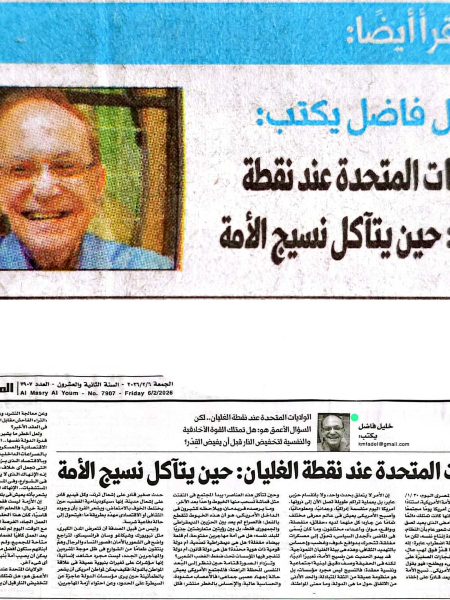 كتب محمد مساهل فى «المصرى اليوم» ٣٠ /١/ ٢٠٢٦، تقريرًا عن تآكل نسيج الأمة الأمريكية، استنادًا إلى «نيويورك تايمز».. لم تكن أمريكا يومًا مجتمعًا سهلًا أو منسجمًا بالكامل، لكنها كانت تمتلك دائمًا ذلك «الغراء» الأمريكى الغامض الذى يعيد لصق الشقوق كلما اتسَّعت، كان هناك شعور عام بأن النظام، رغم صراعاته، قادر على إعادة إنتاج نفسه، لكن ما يرصده فريدمان يتجاوز لحظة اضطراب عابرة؛ إنه يشبه اللحظة التى تهتز فيها قِدْرٌ فوق لهبٍ عالٍ، يعلو فيها البخار، وتبدأ الانفجارات الصغيرة على الجوانب، قبل أن يغلى كل شىء ويطفح؛ فهو يقول ما يهمسه كثيرون فى الداخل الأمريكى.. نسيج الأمة يتآكل، والحلم الأمريكى لم يعد قادرًا على إخفاء الشقوق التى تتسِّع كل يوم.