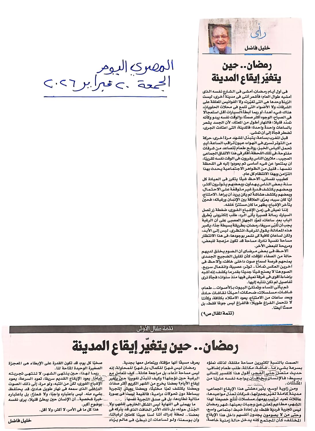 قبل المغرب بساعة، يتبدّل المشهد مرة أخرى، حركة من التوتر تسرى فى الهواء، عيون تراقب الساعة، أيدٍ تحمل أكياس الخبز، روائح طعام تتصاعد من شرفات مفتوحة، فى تلك اللحظة، أفكر فى هذا الاتفاق الجماعى العجيب.. ملايين الناس يقررون، فى الوقت نفسه تقريبًا، أن يمتنعوا عن شىء أساسى ثم يعودوا إليه فى اللحظة نفسها.. قليل من الظواهر الاجتماعية يحدث بهذا التزامن وبهذا الانتظام كل عام.