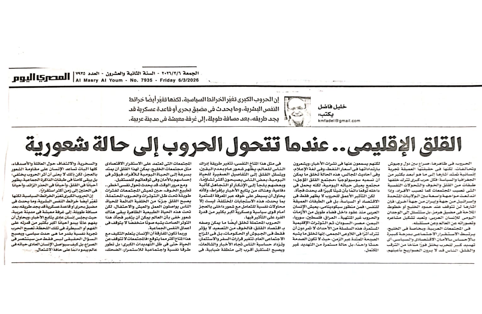 فى مثل هذا المناخ النفسى، تتغير طريقة إدراك الناس للعالم، يظهر شعور عام بعدم اليقين، ويتسلل القلق إلى التفاصيل الصغيرة للحياة اليومية، بعض الناس يصبحون أكثر تشاؤمًا، وبعضهم يلجأ إلى الإنكار أو التجاهل كآلية دفاعية، وهناك من يتابع الأخبار بإفراط، وكأنه يحاول أن يسيطر على خوفه عبر المعرفة المستمرة بما يحدث، هذه الاستجابات المختلفة، ليست إلا محاولات نفسية للتعامل مع شعور داخلى بالعجز أمام قوى سياسية وعسكرية أكبر بكثير من قدرة الفرد على التأثير فيها.