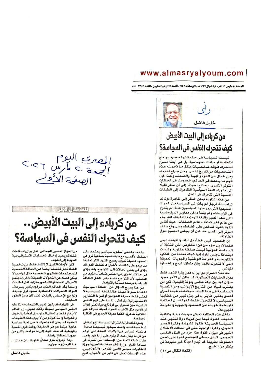 ليست السياسة فى حقيقتها مجرد برامج انتخابية أو بيانات دبلوماسية، بل هى أيضًا مسرح تتحرك فوقه شخصيات، بكل ما تحمله هذه الشخصيات من تاريخ نفسى، ومن جراح قديمة، ومن خيال عن القوة والهيبة والضعف، ولهذا فإن فهم ما يحدث فى العالم، خصوصًا فى لحظات التوتر الكبرى، يحتاج أحيانًا إلى أن ننظر قليلًا إلى ما وراء اللغة السياسية الظاهرة، إلى الطبقات النفسية التى تتحرك فى الظل.