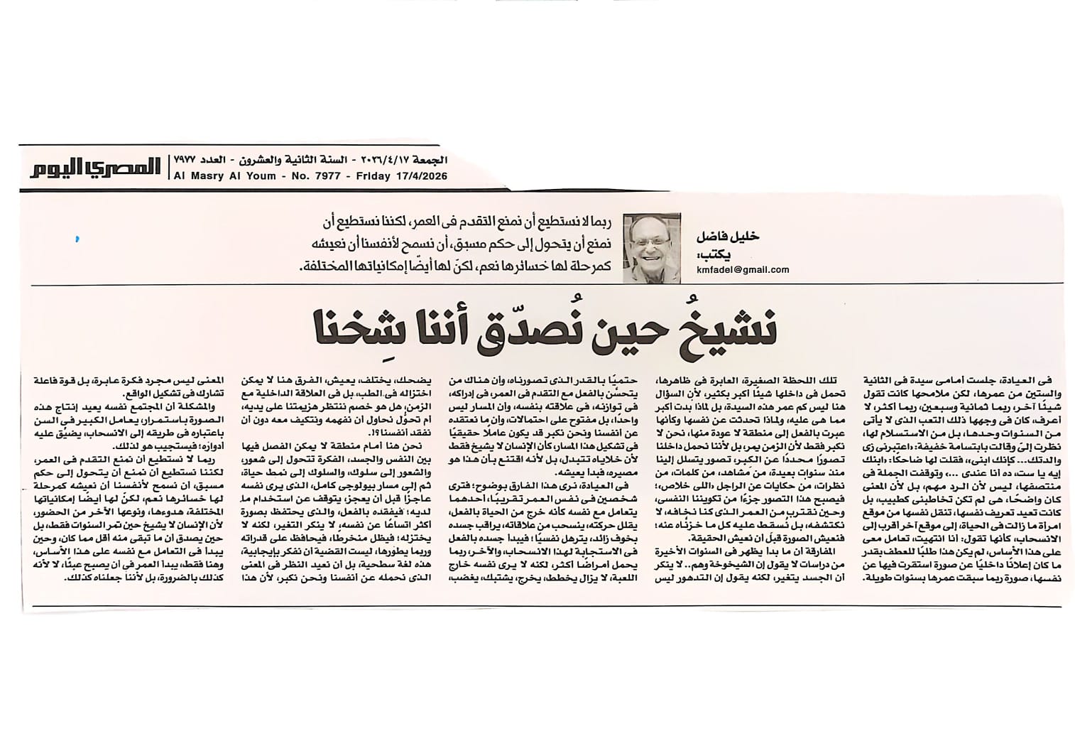 ربما لا نستطيع أن نمنع التقدم فى العمر، لكننا نستطيع أن نمنع أن يتحول إلى حكم مسبق، أن نسمح لأنفسنا أن نعيشه كمرحلة لها خسائرها نعم، لكنّ لها أيضًا إمكانياتها المختلفة، هدوءها، ونوعها الآخر من الحضور، لأن الإنسان لا يشيخ حين تمر السنوات فقط، بل حين يصدق أن ما تبقى منه أقل مما كان، وحين يبدأ فى التعامل مع نفسه على هذا الأساس، وهنا فقط، يبدأ العمر فى أن يصبح عبئًا، لا لأنه كذلك بالضرورة، بل لأننا جعلناه كذلك.